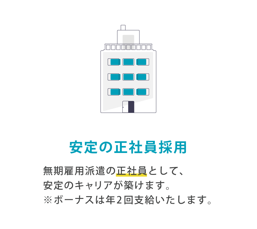 雇用形態:正社員(無期雇用派遣) 雇用期間:期間の定めなし 試用期間:あり(3ヶ月) ※詳細は面談の際にお伝えします。 » 無期雇用派遣とは、当社の正社員として入社していただいた上で、大手メーカーをはじめとするプロジェクトに従事していただく働き方です。一般的な登録型派遣とは異なり、「正社員型派遣」となるため、雇用期間に期限はありません。派遣期間以外でも給与は保障されますし、賞与も支給されます。 |
